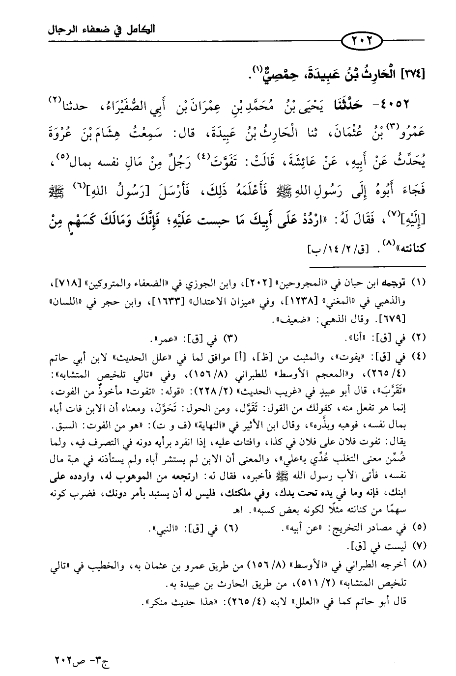 قال ابن عدي: وهذا الحديث عن هشام بن عروة غريب، لا أَعلم يرويه عنه غير الحارث بن عبيدة، ويُروَى عن وكيع عن هشام بن عروة، رَوى عنه شيخ ضعيف يُقال له: الحسن بن عَبد الرحمن الاحتياطي.