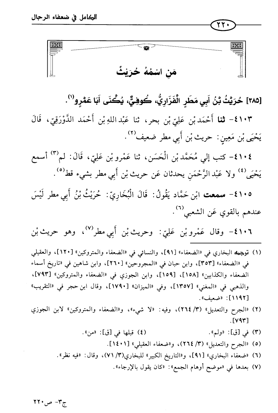 4105 - سمعتُ ابن حماد يقول: قال البُخاري: حريث بن أبي مطر ليس عندهم بالقوي، عن الشعبي.