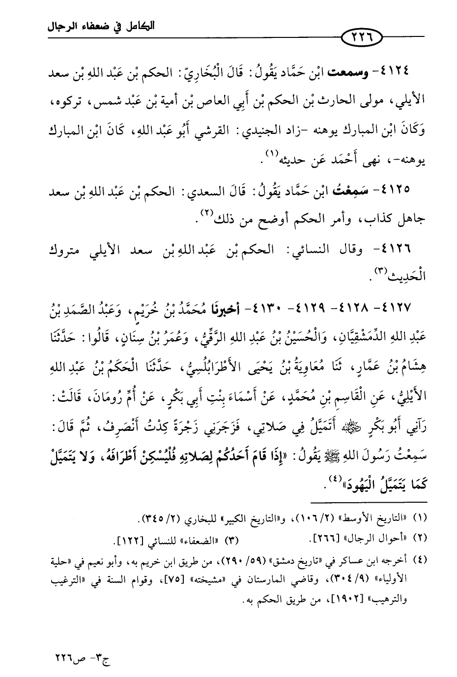 4127 - 4128 - 4129 - 4130 - أخبرنا مُحمد بن خريم، وعَبد الصمد بن عَبد الله، الدمشقيان، والحُسَين بن عَبد الله الرقي، وعمر بن سنان، قالوا: حَدثنا هشام بن عمار، حَدثنا معاوية بن يَحيى الأطرابلسي، حَدثنا الحكم بن عَبد الله الأَيلِي، عن القاسم بن مُحمد، عن أسماء بنت أبي بكر، عن أُم رومان قالت: رآني أَبو بكر رضي الله عنه أتميل في صلاتي فزجرني زجرة كدت أنصرف، ثم قال: سمعتُ رسول الله صَلى الله عَليه وسَلم يقول: إذا قام أحدكم لصلاته فليسكن أطرافه، ولا يتميل كما يتميل اليهود.