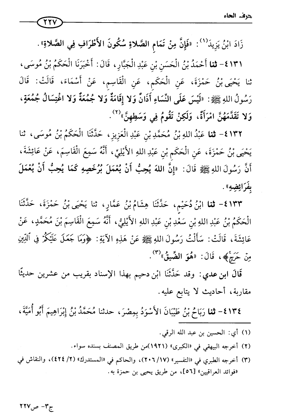 4133 - حَدثنا ابن دحيم، حَدثنا هشام بن عمار، حَدثنا يَحيى بن حمزة، حَدثنا الحكم بن عَبد الله بن سعد بن عَبد الله الأَيلِي، أنه سمع القاسم بن مُحمد، عن عائشة قالت: سألت رسول الله صَلى الله عَليه وسَلم عن هذه الآية: {وما جعل عليكم في الدين من حرج} قال: هو الضيق.