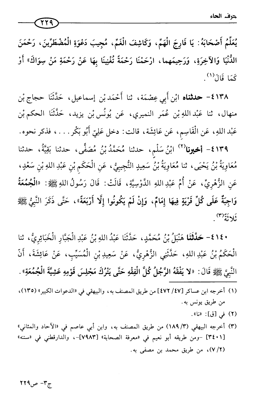 4140 - حَدثنا هنبل بن مُحمد، حَدثنا عَبد الله بن عَبد الجبار الخبائري، حَدثنا الحكم بن عَبد الله، حَدَّثني الزُّهْري، عن سعيد بن المُسَيَّب، عن عائشة؛ أَن النبي صَلى الله عَليه وسَلم، قال: لا يفقه الرجل كل الفقه حتى يترك مجلس قومه عشية الجمعة.