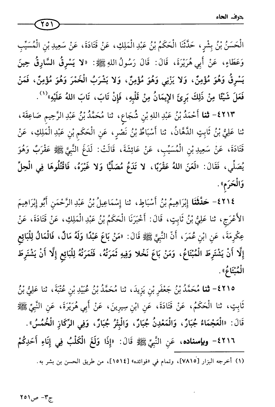 (1) يَعني بإسناد الحديث السابق: حَدثنا مُحمد بن جعفر بن يزيد، حَدثنا مُحمد بن عُبيد بن عتبة، حَدثنا علي بن ثابت، حَدثنا الحكم، عن قَتادَة، عن ابن سِيرين، عن أبي هريرة.