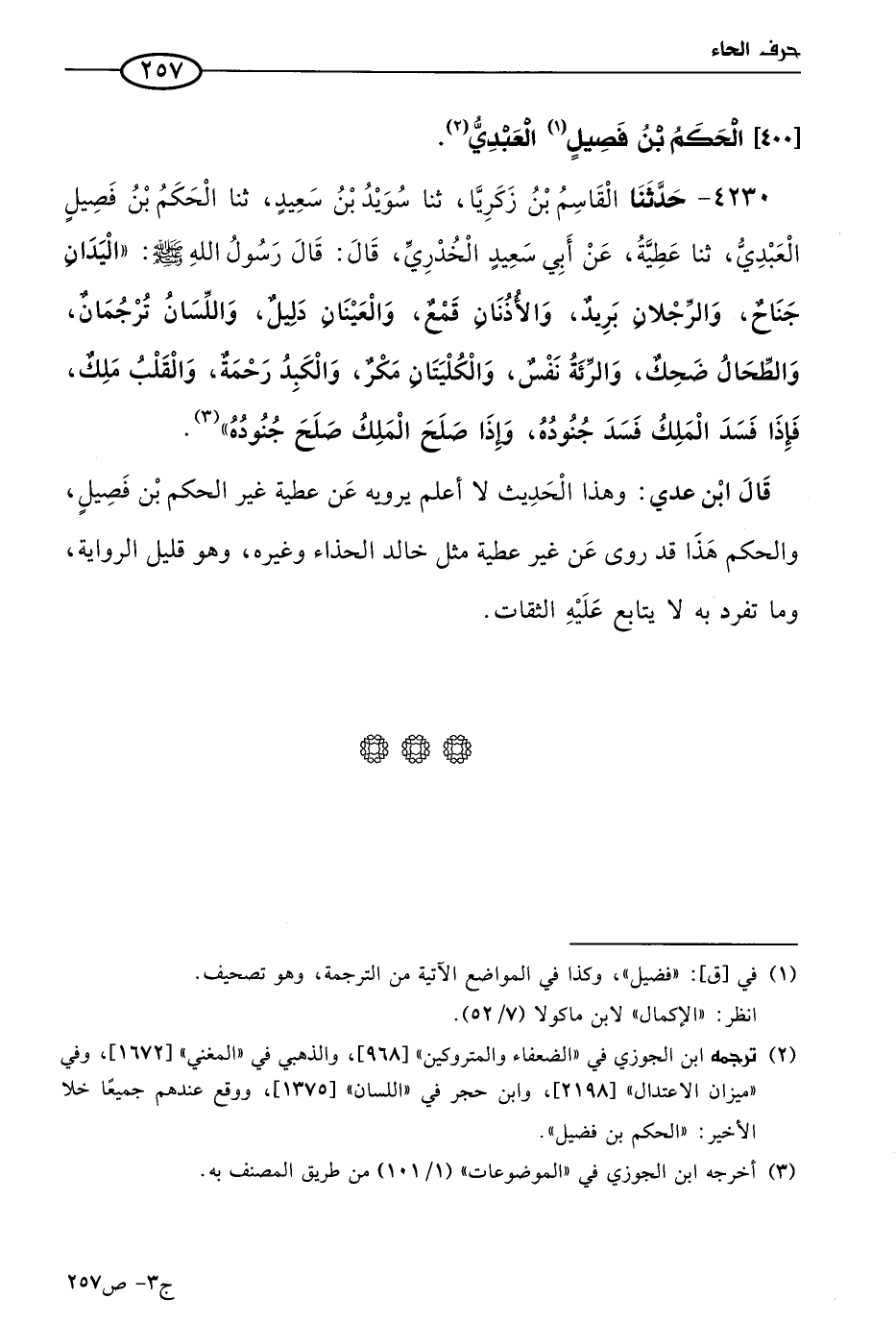 4230 - حَدثنا القاسم بن زكريا، حَدثنا سويد بن سعيد، حَدثنا الحكم بن فَصِيلٍ العبدي، حَدثنا عطية، عن أبي سعيد الخدري، قال: قال رسول الله صَلى الله عَليه وسَلم: اليدان جناح والرجلان بريد والأُذنان قمع، والعينان دليل، واللسان ترجمان، والطحال ضحك والرئة نفس، والكليتان مكر، والكبد رحمة، والقلب ملك، فإذا فسد الملك فسد جنوده، وإذا صلح الملك صلح جنوده.