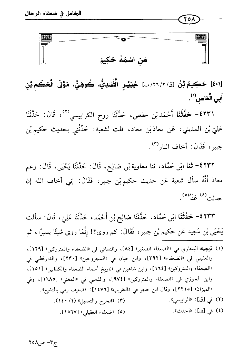 4231 - حَدثنا أحمد بن حفص، حَدثنا روح الكرابيسي، قال: حَدثنا علي بن المديني، عن معاذ بن معاذ قلت لشعبة: حَدَّثني بحديث حكيم بن جُبَير، فقال: أخاف النار.