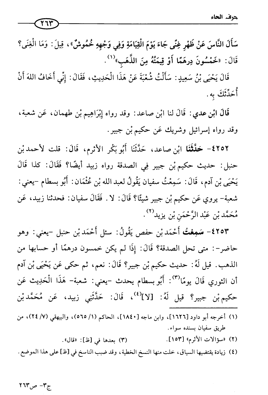 4253 - سمعت أحمد بن حفص يقول: سئل أحمد بن حنبل، يعني وهو حاضر: متى تحل الصدقة؟ قال: إذا لم يكن خمسون درهما أو حسابها من الذهب، قيل له: حديث حكيم بن جُبَير؟ قال: نَعم، ثم حكى عن يَحيى بن آدم؛ أن الثَّوري قال يومًا: أَبو بسطام يحدث، يعني شُعبَة، هذا الحديث عن حكيم بن جُبَير؟ قيل له: [لا] (1)، قال: حَدَّثني زبيد، عن مُحمد بن عَبد الرحمن، ولم يزد عليه، قال أحمد: كأنه أرسله، أو كره أن يحدث به، أما تعرف الرجل؟! كلاما نحو ذا.