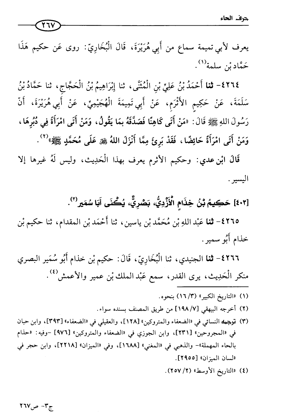 4266 - حَدثنا الجنيدي، حَدثنا البُخاري قال: حكيم بن خذام أَبو سُمير البصري، منكر الحديث، يرى القدر، سمع عَبد الملك بن عُمَير والأعمش.