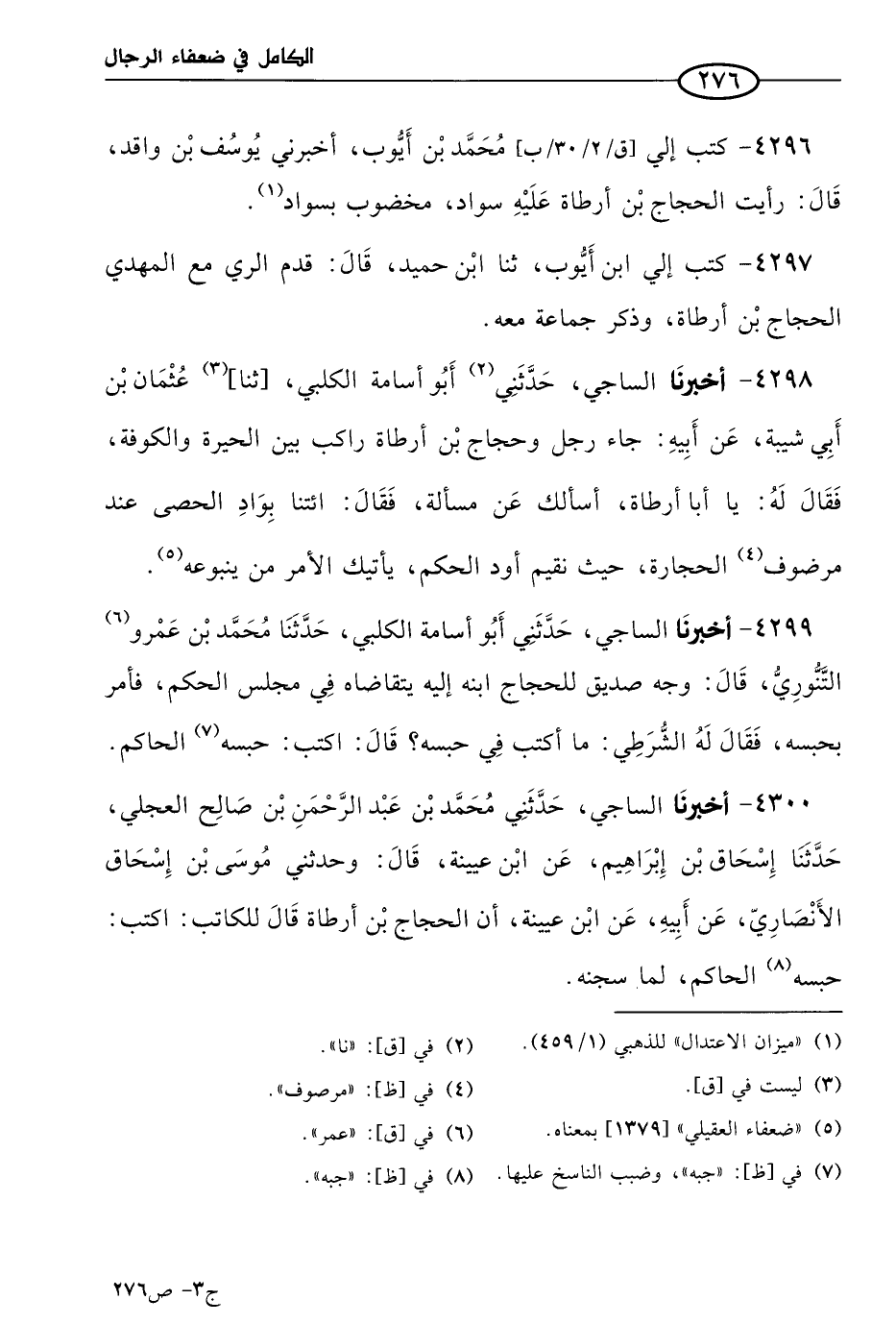 4297 - كتب إليَّ ابن أيوب، حَدثنا ابن حميد قال: قدم الري مع المهدي الحجاج بن أرطاة، وذكر جماعة معه.