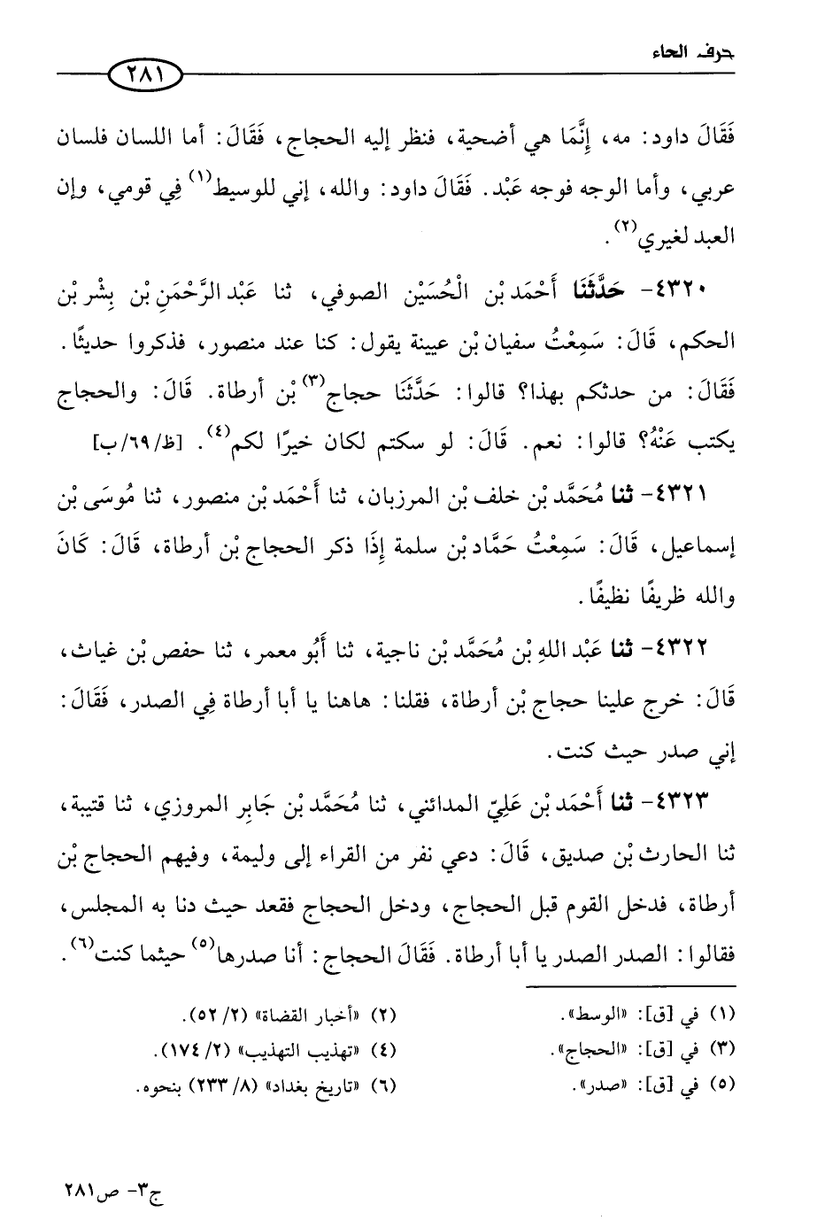 4320 - حَدثنا أحمد بن الحسين الصُّوفي، حَدثنا عَبد الرحمن بن بشر بن الحكم، قال: سمعتُ سفيان بن عُيَينة يقول: كنا عند منصور فذكروا حديثًا فقال: من حدثكم بهذا؟ قالوا: حَدثنا حجاج بن أرطاة، قال: والحجاج يُكْتَب عنه؟ قالوا: نعم، قال: لو سكتم لكان خيرًا لكم.