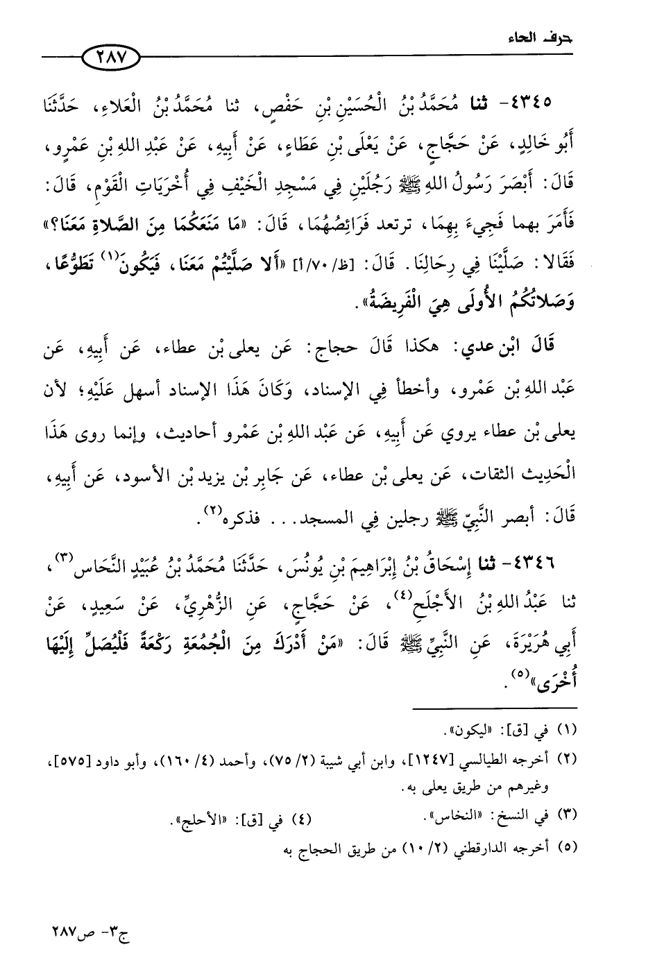 قال ابنُ عَدِي: هكذا قال حجاج، عن يَعلَى بن عطاء، عن أبيه، عن عَبد الله بن عَمرو، وأخطأ في الإسناد، وكان هذا الإسناد أسهل عليه، لأن يَعلَى بن عطاء، يروي عن أبيه، عن عَبد الله بن عَمرو أحاديث، وإِنما روى هذا الحديث الثقات عن يَعلَى بن عَطاء، عن جابر بن يزيد بن الأسود، عن أبيه، قال: أبصر النبي صَلى الله عَليه وسلم رجلين في المسجد، فذكره.
