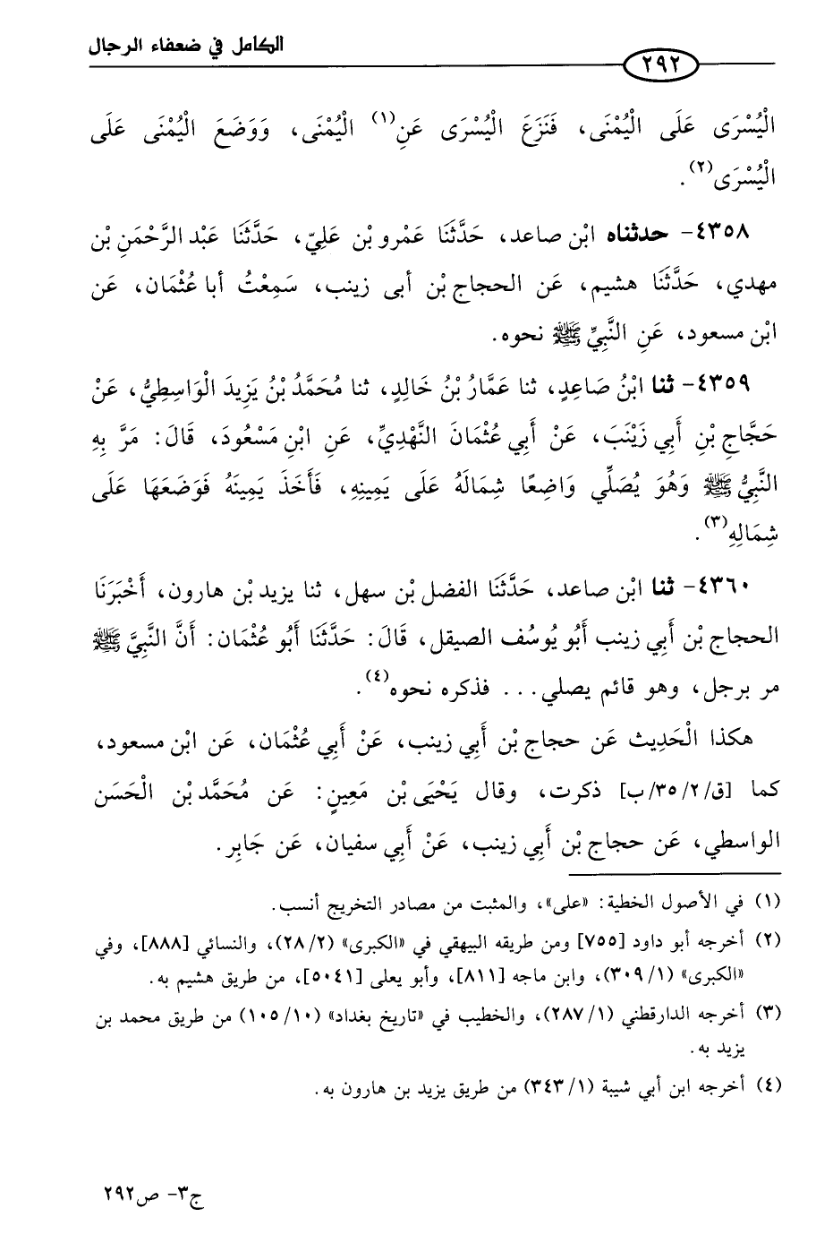 4359 - حَدثنا ابن صاعد، حَدثنا عمار بن خالد، حَدثنا مُحمد بن يزيد الواسطي، عن حجاج بن أبي زينب، عن أبي عثمان النهدي، عن ابن مسعود، قال: مر به النبي صَلى الله عَليه وسلم وهو يصلي، واضعا شماله على يمينه، فأخذ يمينه فوضعها على شماله.