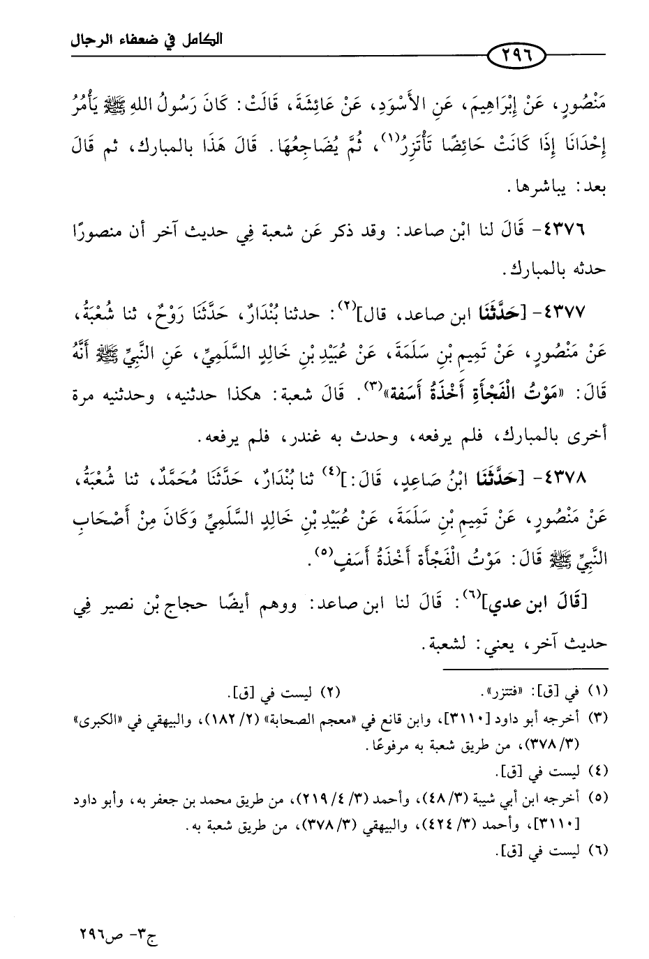4377 - حدثنا ابن صاعد، قال: حَدثنا بُنْدَار، حَدثنا روح، حَدثنا شُعبَة، عن منصور، عن تميم بن سلمة، عن عُبيد بن خالد السلمي، عن النبي صَلى الله عَليه وسلم، أنه قال: موت الفجأة أخذة أسفة.