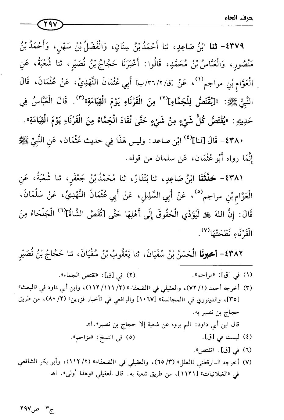 4379 - حَدثنا ابن صاعد، حَدثنا أحمد بن سنان، والفضل بن سهل، وأحمد بن منصور، والعباس بن مُحمد، قالوا: حدثنا حجاج بن نصير، حَدثنا شُعبَة، عن العوام بن مراجم، عن أبي عثمان النهدي، عن عثمان، قال النبي صَلى الله عَليه وسلم: يقتص للجماء من القرناء يوم القيامة.