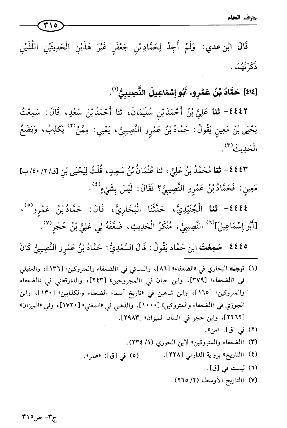 4444 - حَدثنا الجنيدي، حَدثنا البُخاري قال: حماد بن عَمرو، أَبو إسماعيل النصيبي منكر الحديث، ضعفه لي علي بن حُجْر.