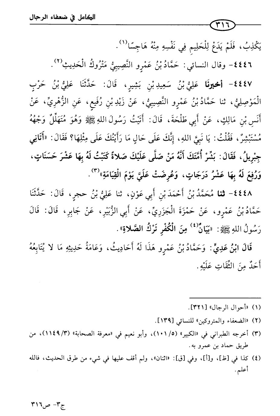 4448 - حَدثنا مُحمد بن أحمد بن أبي عون، حَدثنا علي بن حجر، قال: حَدثنا حماد بن عَمرو، عن حمزة الجزري، عن أبي الزبير، عن جابر، قال: قال رسول الله صَلى الله عَليه وسَلم: بيان من الكفر ترك الصلاة.