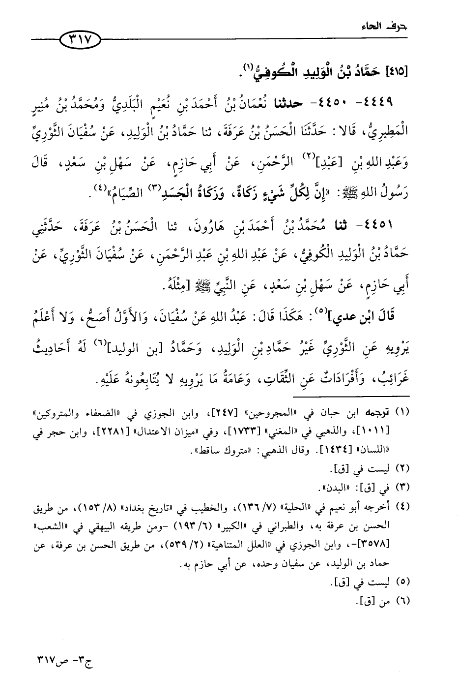 4449 - 4450 - حَدثنا نعمان بن أحمد بن نعيم البلدي، ومُحمد بن منير المطيري، قالا: حَدثنا الحسن بن عرفة، حَدثنا حماد بن الوليد، عن سفيان الثَّوري، وعَبد الله بن عَبد الرحمن، عن أبي حازم، عن سهل بن سعد، قال رسول الله صَلى الله عَليه وسَلم: إن لكل شيء زكاة، وزكاة الجسد الصيام.