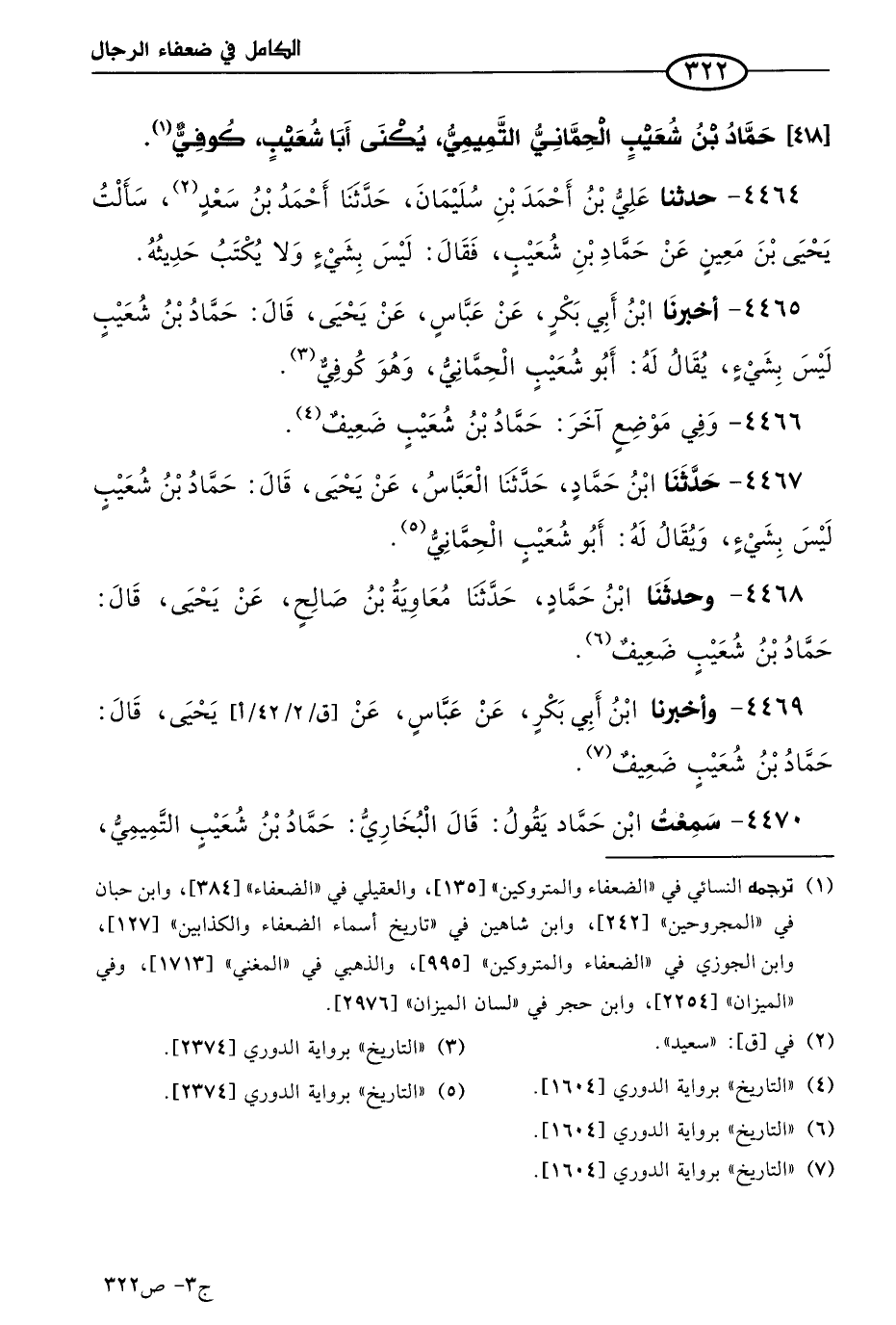 4469 - وأخبرنا ابن أبي بكر، عن عباس، عن يَحيى، قال: حماد بن شُعَيب ضعيف.