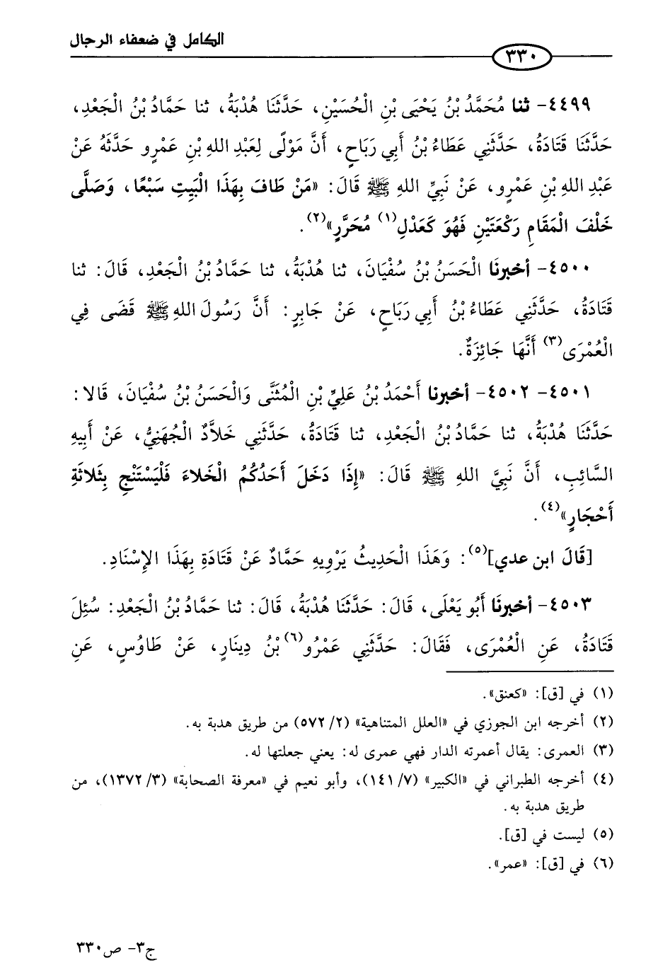 4499 - حَدثنا مُحمد بن يَحيى بن الحسين، حَدثنا هدبة، حَدثنا حماد بن الجعد، حَدثنا قتادة، حَدَّثني عطاء بن أبي رياح، أن مولى لعبد الله بن عَمرو حدثه عن عَبد الله بن عَمرو، عن نبي الله صَلى الله عَليه وسَلم قال: من طاف بهذا البيت سبعا وصلى خلف المقام ركعتين فهو كعدل محرر.