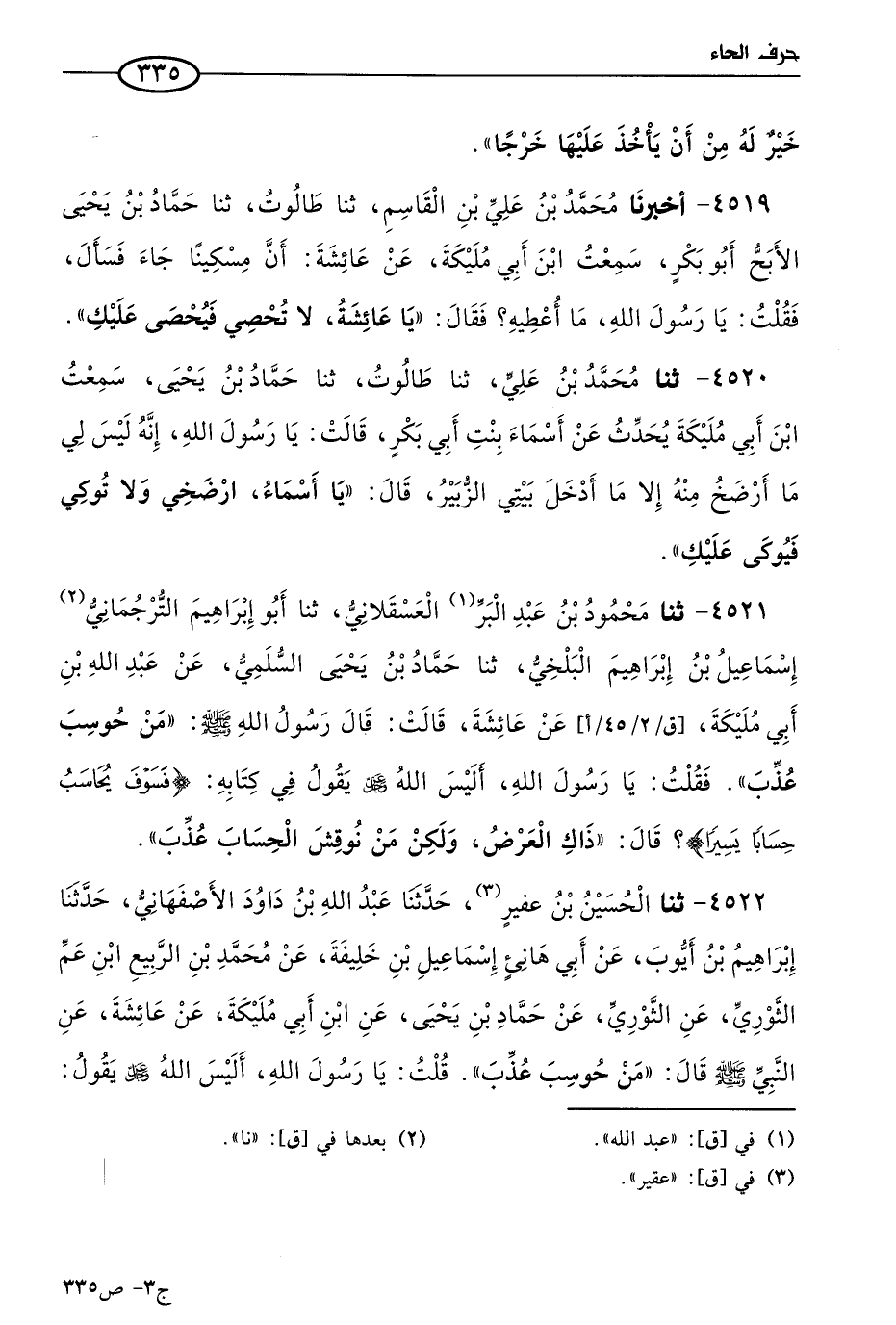 4521 - حَدثنا محمود بن عَبد البر العسقلاني، حَدثنا أَبو إبراهيم الترجماني إسماعيل بن إبراهيم البلخي، حَدثنا حماد بن يَحيى السلمي، عن عَبد الله بن أبي مليكة، عن عائشة قالت: قال رسول الله صَلى الله عَليه وسلم: من حوسب عذب، فقلت: يا رسول الله، أليس الله عَزّ وجَلّ يقول في كتابه: {فسوف يحاسب حسابا يسيرا} قال: ذاك العرض، ولكن من نوقش الحساب عذب.