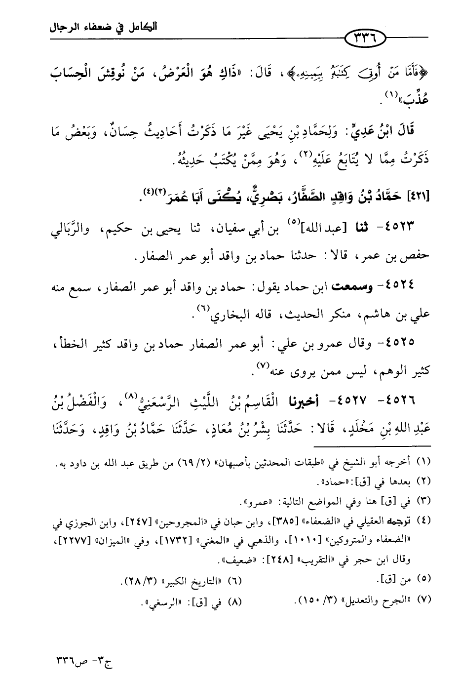 4525 - وقال عَمرو بن علي: أَبو عُمر الصفار حماد بن واقد كثير الخطأ، كثير الوهم، ليس ممن يُروَى عنه.