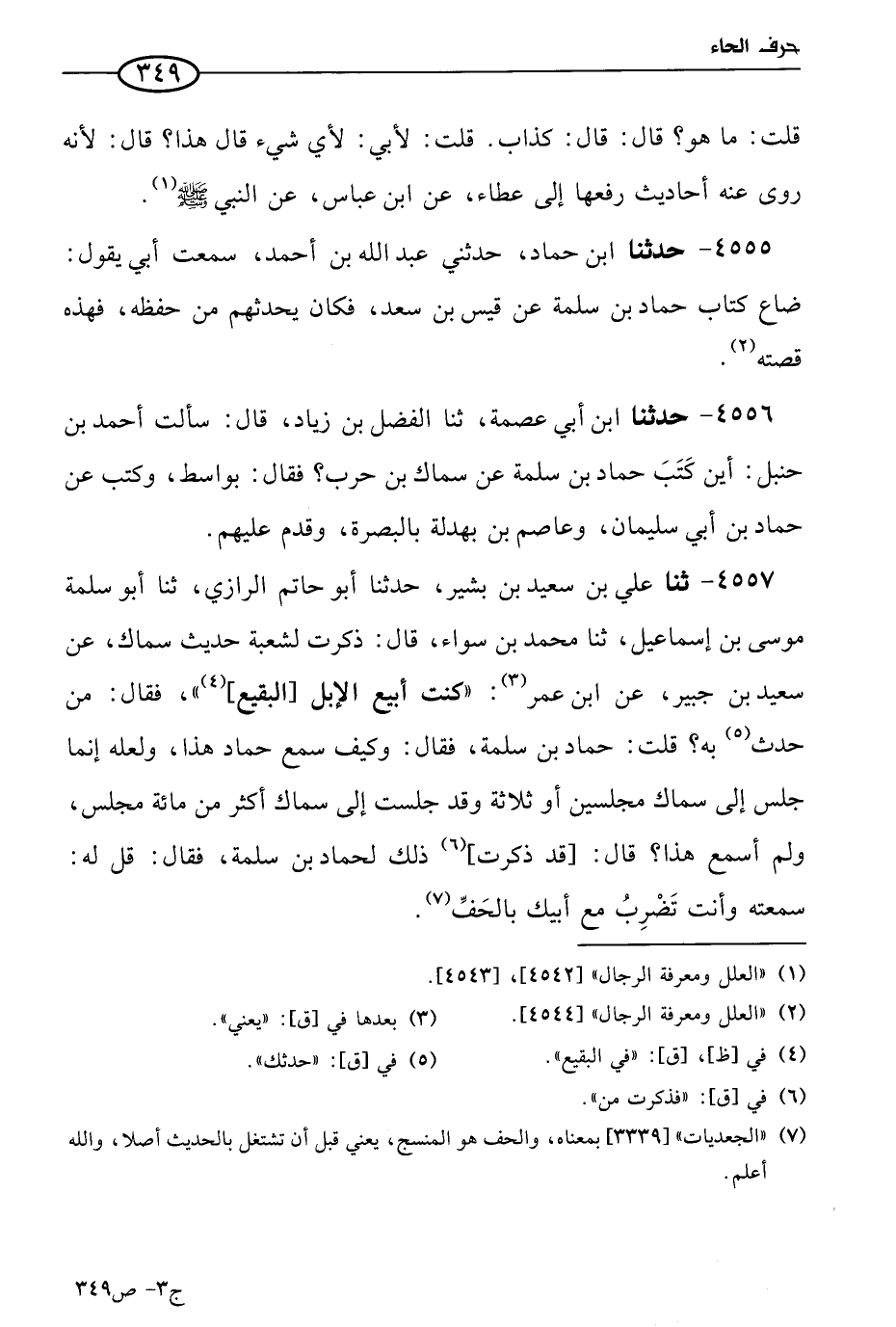 4557 - حَدثنا علي بن سعيد بن بشير، حَدثنا أَبو حاتم الرازي، حَدثنا أَبو سلمة موسى بن إسماعيل، حَدثنا مُحمد بن سواء قال: ذكرت لشعبة حديث سماك، عن سعيد بن جُبَير، عن ابن عُمر؛ كنت أبيع الإبل بالبقيع (1). فقال: من حدث به؟ قلت: حماد بن سلمة، فقال: وكيف سمع حماد هذا، ولعله إنما جلس إلى سماك مجلسين أو ثلاثة، وقد جلست إلى سماك أكثر من مِئَة مجلس ولم أَسمَع هذا، قال: قد ذكرت ذلك لحماد بن سلمة فقال: قل له: سمعته وأنت تضرب مع أبيك بالحَف.