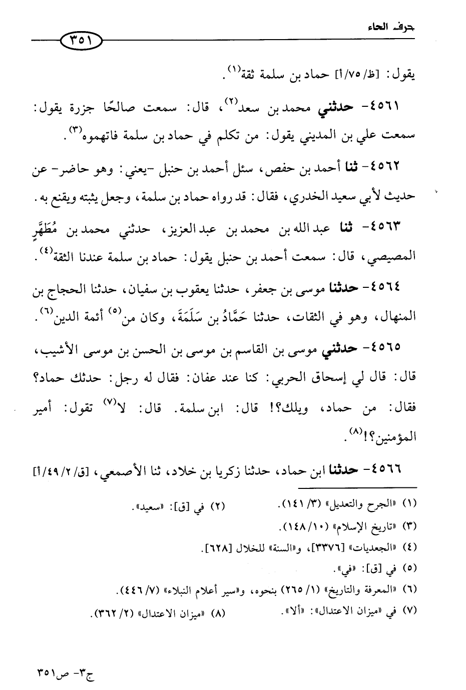 4564 - حَدثنا موسى بن جعفر، حَدثنا يعقوب بن سفيان، حَدثنا الحجاج بن المنهال، وهو في الثقات، حَدثنا حماد بن سلمة، وكان من أئمة الدين.