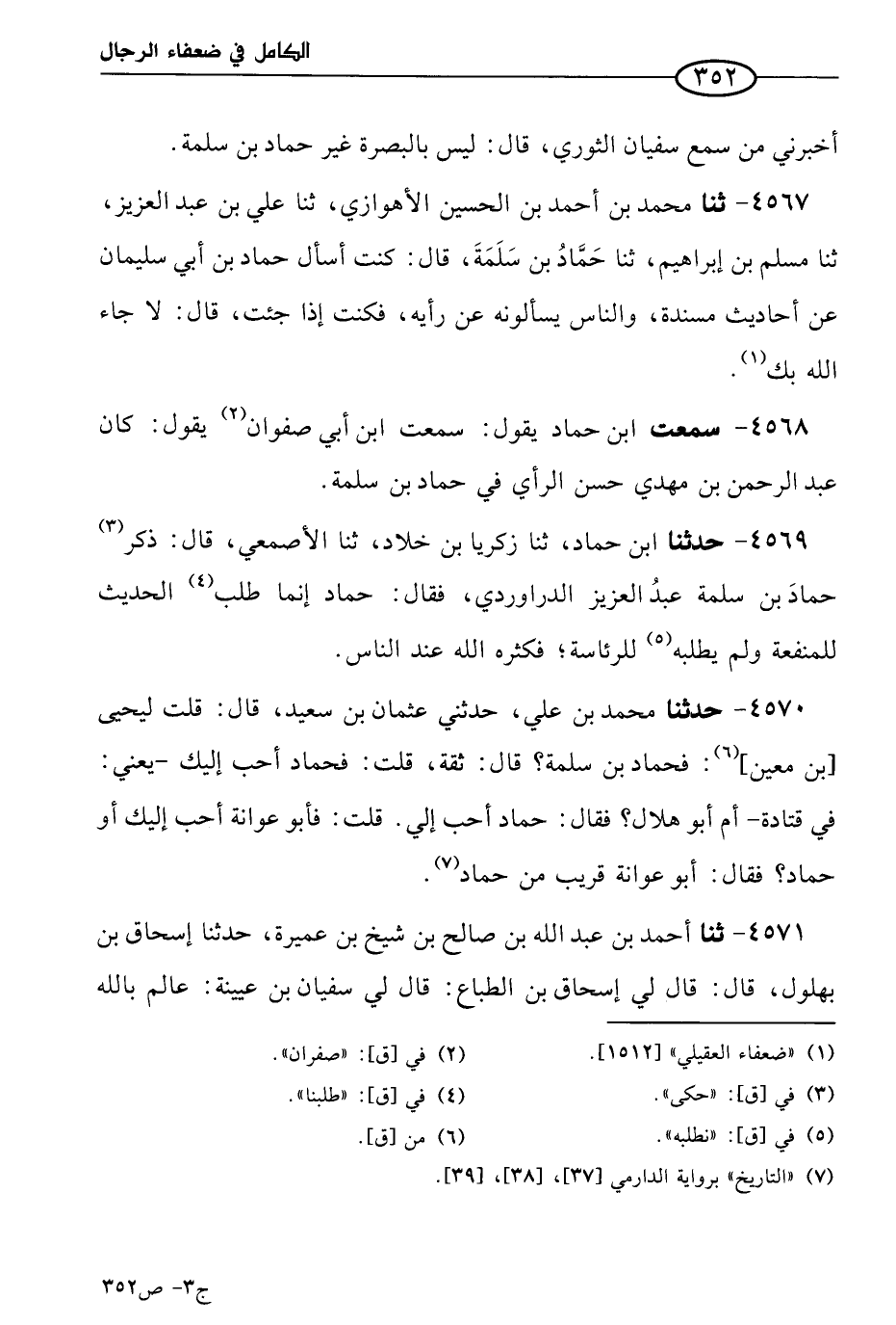 4570 - حَدثنا مُحمد بن علي، حَدَّثني عثمان بن سعيد، قال: قلتُ ليحيى بن مَعين: فحماد بن سلمة؟ قال: ثقةٌ، قلت: فحماد أحب إليك، يعني في قتادة، أم أَبو هلال؟ فقال: حماد أحب إلي، قلت: فأبو عَوَانة أحب إليك، أو حماد؟ فقال: أَبو عَوَانة قريب من حماد.