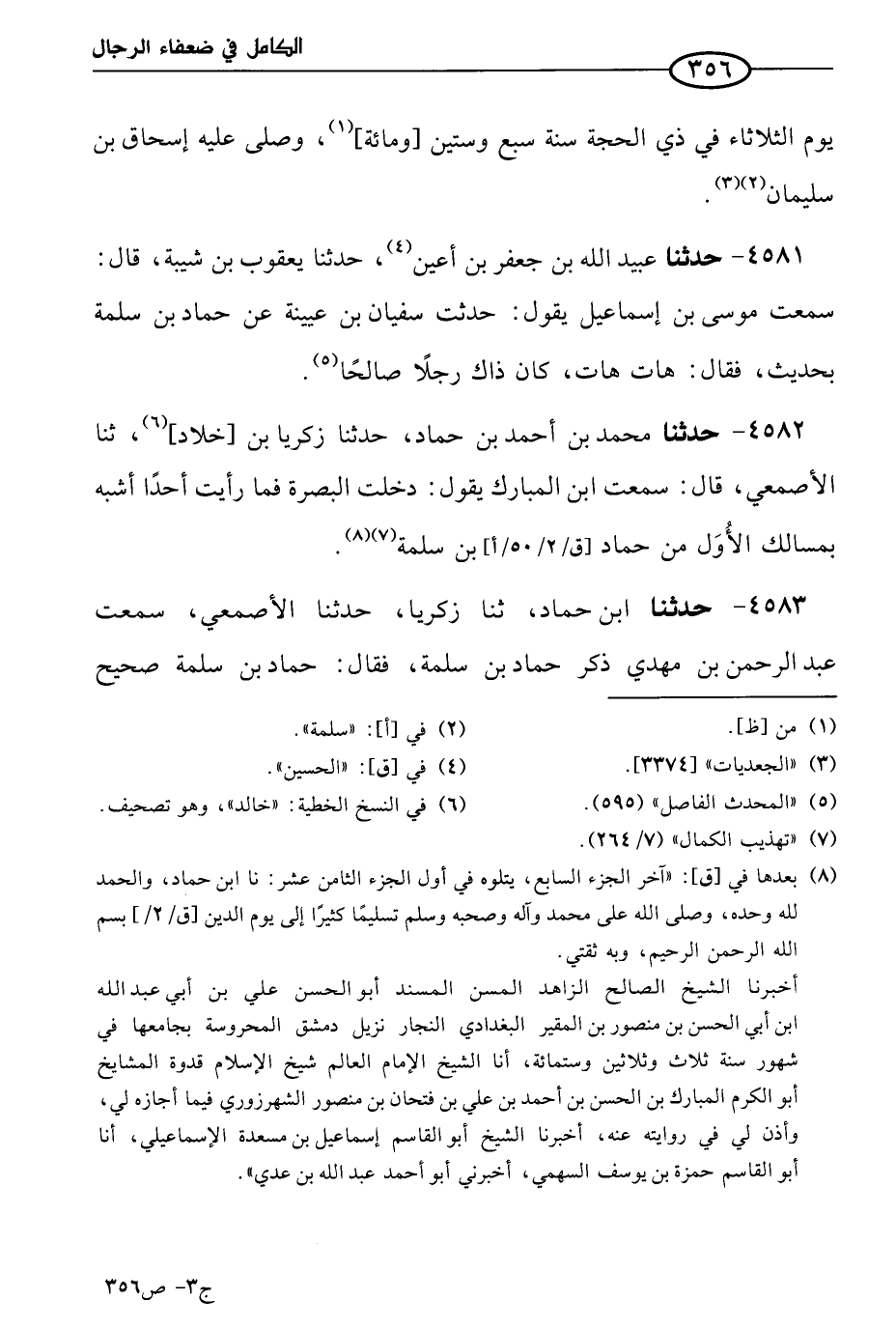 4583 - حَدثنا ابن حماد، حَدثنا زكريا، حَدثنا الأصمعي، سمعت عَبد الرحمن بن مهدي ذكر حماد بن سلمة فقال: حماد بن سلمة صحيح السماع، حسن اللقي، أدرك الناس، لم يُتَّهم بلون من الألوان، ولم يلتبس بشَيءٍ أحسن ملكة نفسه ولسانه، ولم يطلقه على أحد، ولا ذكر خلقا بسوء، فسلم حتى مات.