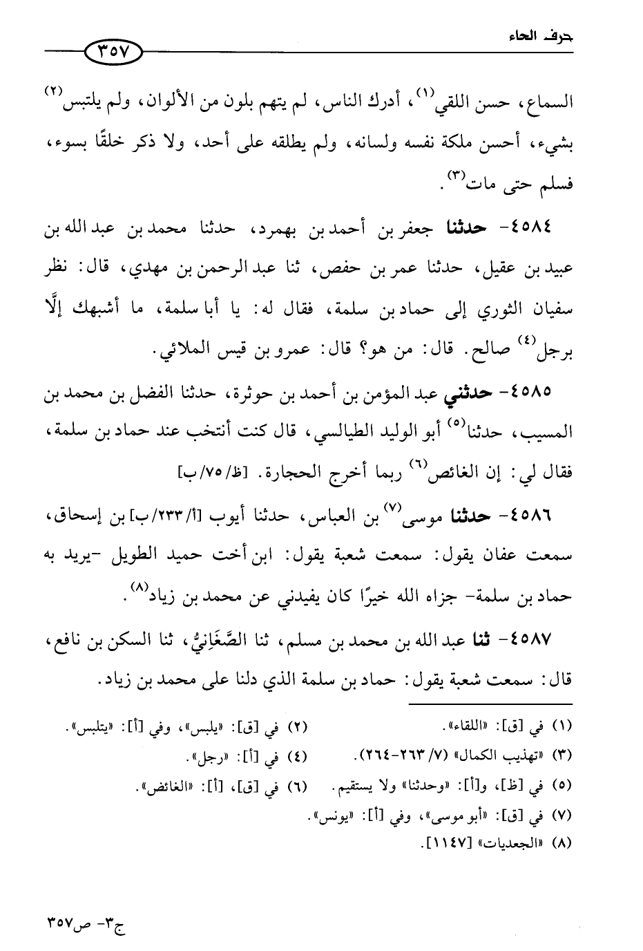 4586 - حَدثنا موسى بن العباس، حَدثنا أيوب بن إسحاق، سمعت عفان يقول: سَمعتُ شُعبَة يقول: ابن أخت حميد الطويل، يريد به حماد بن سلمة، جزاه الله خيرًا، كان يفيدني عن مُحمد بن زياد.