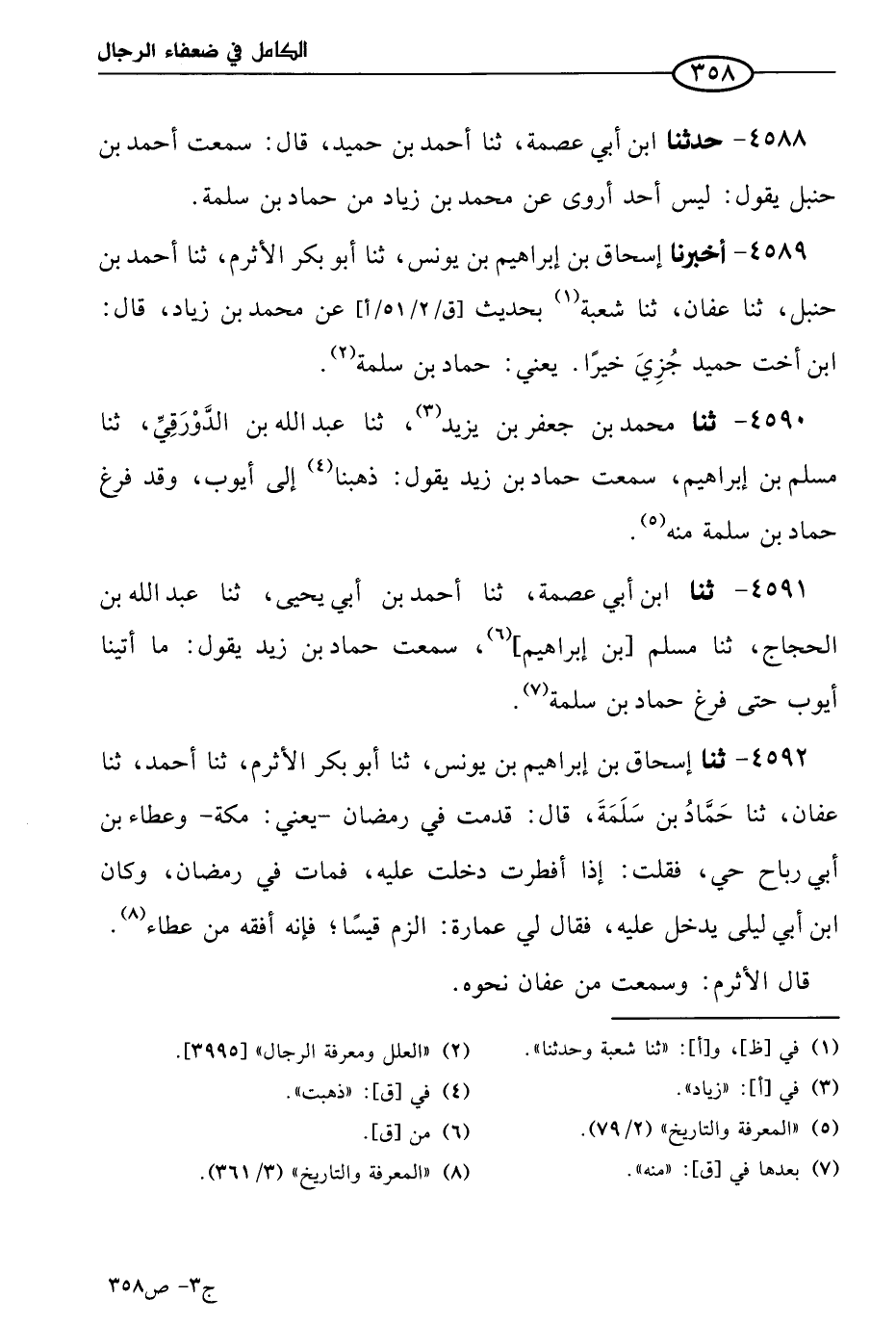 4589 - أخبرنا إسحاق بن إبراهيم بن يُونُس، حَدثنا أَبو بكر الأثرم، حَدثنا أحمد بن حنبل، حَدثنا عفان، حَدثنا شُعبَة بحديث عن مُحمد بن زياد، قال: ابن أخت حميد جُزِي خيرًا، يعني حماد بن سلمة.