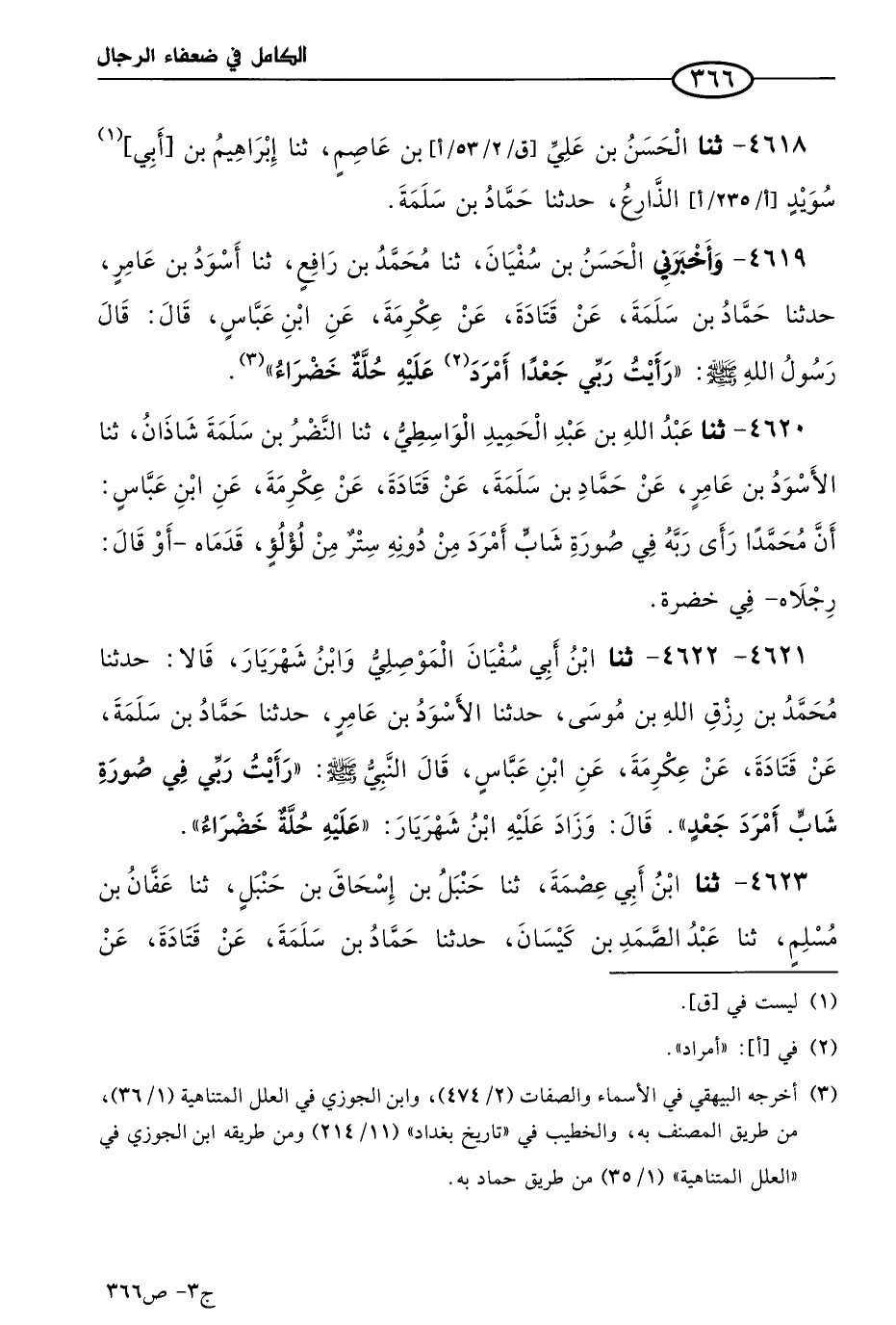 4621 - 4622 - حَدثنا ابن أبي سفيان الموصلي، وابن شهريار، قالا: حَدثنا مُحمد بن رزق الله بن موسى، حَدثنا الأسود بن عامر، حَدثنا حماد بن سلمة، عن قَتادَة، عن عِكرمَة، عن ابن عباس، قال النبي صَلى الله عَليه وسلم: رأيت ربي في صورة شاب أمرد جعد، قال: وزاد عليه ابن شهريار: عليه حلة خضراء.