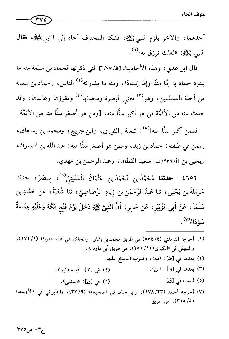 4652 - حَدثنا مُحمد بن أحمد بن عثمان المدِينِي بمصر، حَدثنا حرملة بن يَحيى، حَدثنا عَبد الرحمن بن زياد الرصاصي، حَدثنا شُعبَة، عن حماد بن سلمة، عن أبي الزبير، عن جابر، أَن النَّبي صَلى الله عَليه وسلم دخل يوم فتح مكة وعليه عمامة سوداء.