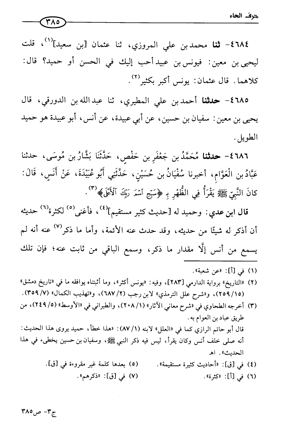 4685 - حَدثنا أحمد بن علي المطيري، حَدثنا عَبد الله بن الدورقي، قال يَحيى بن مَعين: سفيان بن حسين، عن أبي عبيدة، عن أَنَس؛ أَبو عبيدة: هو حميد الطويل.