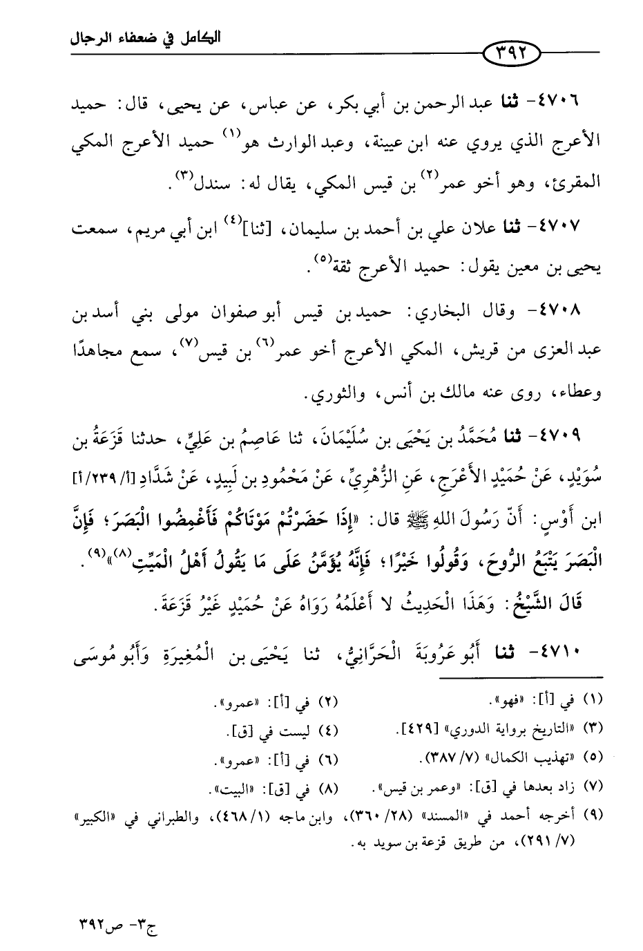 4706 - حَدثنا عَبد الرحمن بن أبي بكر، عن عباس، عن يَحيى، قال: حميد الأعرج الذي يروي عنه ابن عُيَينة، وعَبد الوارث هو حميد الأعرج المَكِّي المقرىء، وهو أخو عَمر بن قيس المَكِّي، يُقال له: سندل.