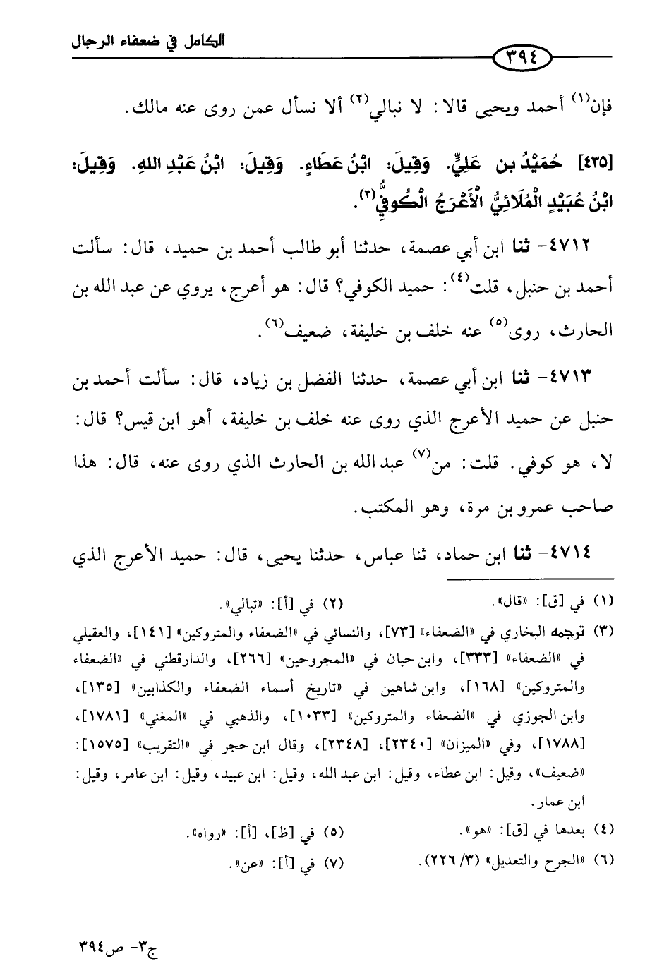 4712 - حَدثنا ابن أبي عصمة، حَدثنا أَبو طالب أحمد بن حميد، قال: سألت أحمد بن حنبل، قلت: حميد الكوفي؟ قال: هو أعرج، يروي عن عَبد الله بن الحارث، روى عنه خلف بن خليفة، ضعيف.