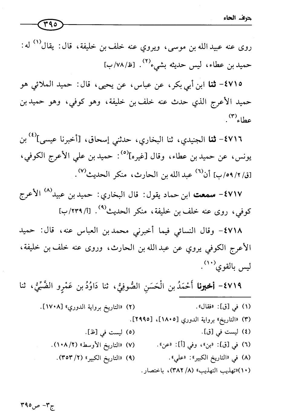 4715 - حَدثنا ابن أبي بكر، عن عباس، عن يَحيى، قال: حميد الملائي هو حميد الأعرج الذي حدث عنه خلف بن خليفة، وهو كوفي، وهو حميد بن عطاء.