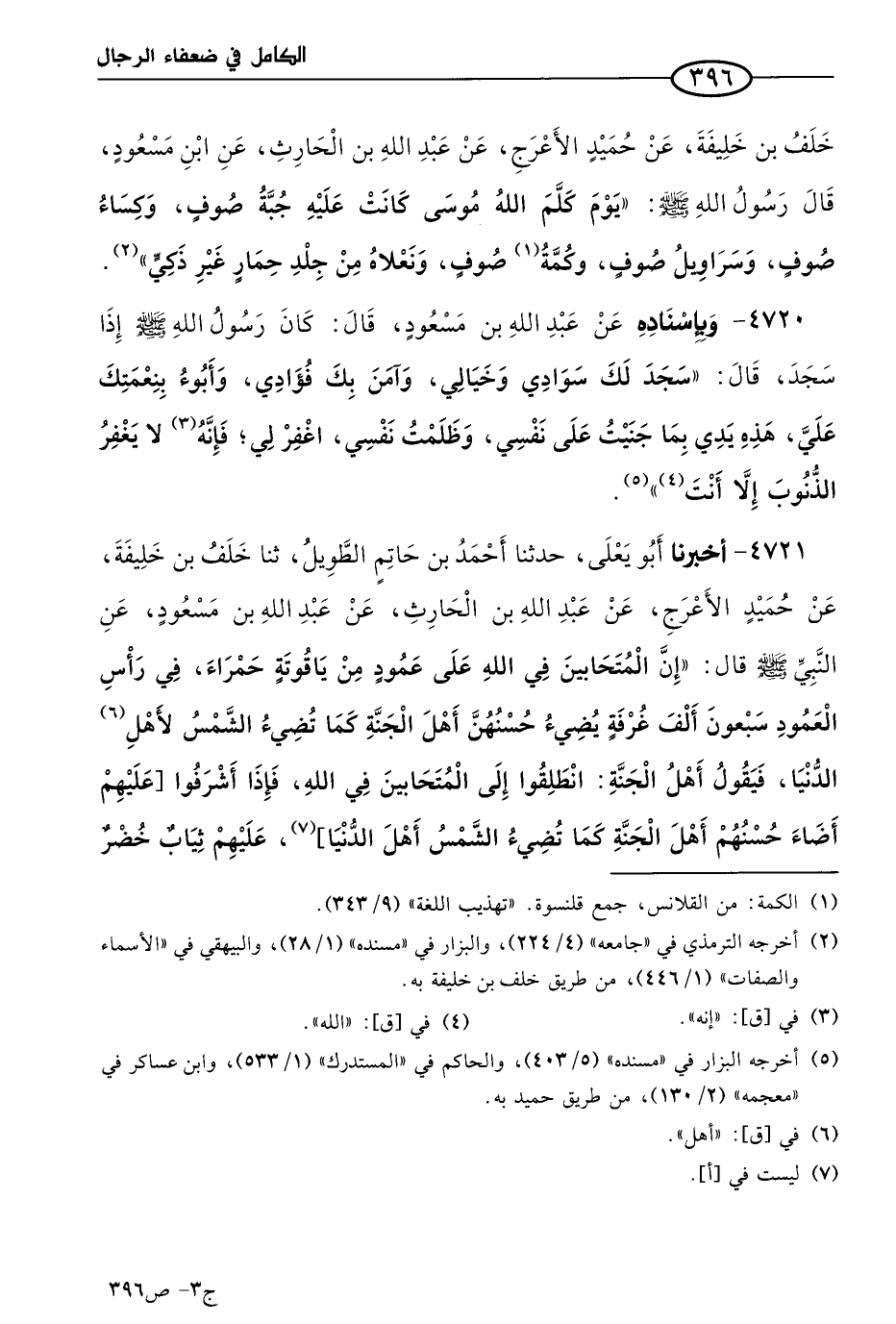 4721 - أخبرنا أَبو يَعلَى، حَدثنا أحمد بن حاتم الطويل، حَدثنا خلف بن خليفة، عن حميد الأعرج، عن عَبد الله بن الحارث، عن عَبد الله بن مسعود، عن النبي صَلى الله عَليه وسلم، قال: إن المتحابين في الله على عمود من ياقوتة حمراء، في رأس العمود سبعون ألف غرفة، يضيء حسنهن أهل الجنة كما تضيء الشمس لأهل الدنيا، فيقول أهل الجنة: انطلقوا إلى المتحابين في الله، فإذا أشرفوا عليهم أضاء حسنهم أهل الجنة كما تضيء الشمس أهل الدنيا، عليهم ثياب خضر من سندس، مكتوب على جباههم: هؤلاء المتحابين في الله.