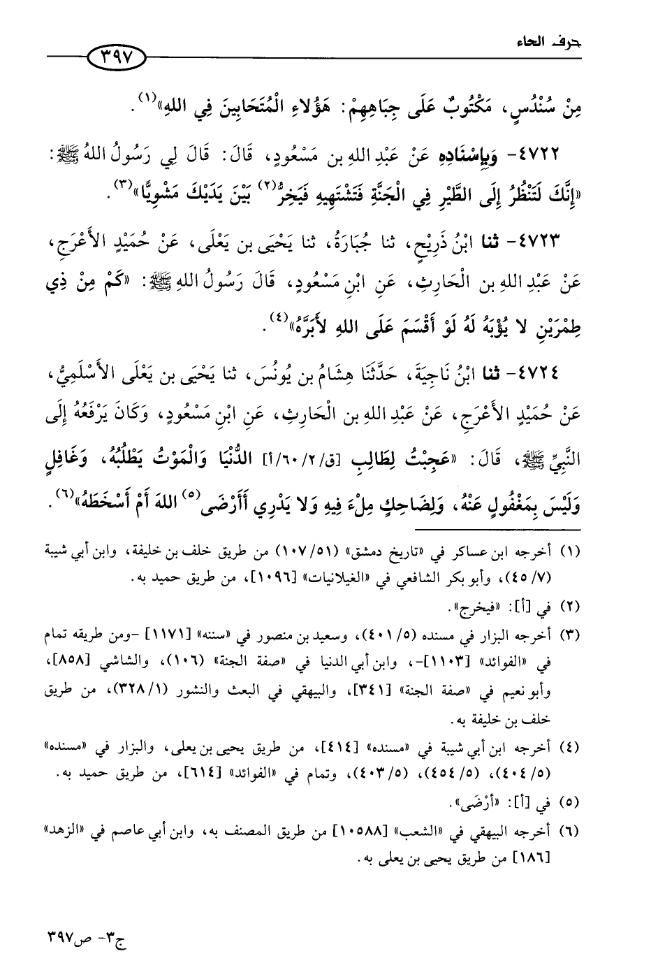 4722 - وبإسناده (1)؛ عن عَبد الله بن مسعود، قال: قال لي رسول الله صَلى الله عَليه وسَلم: إنك لتنظر إلى الطير في الجنة فتشتهيه فيخر بين يديك مشويا.
