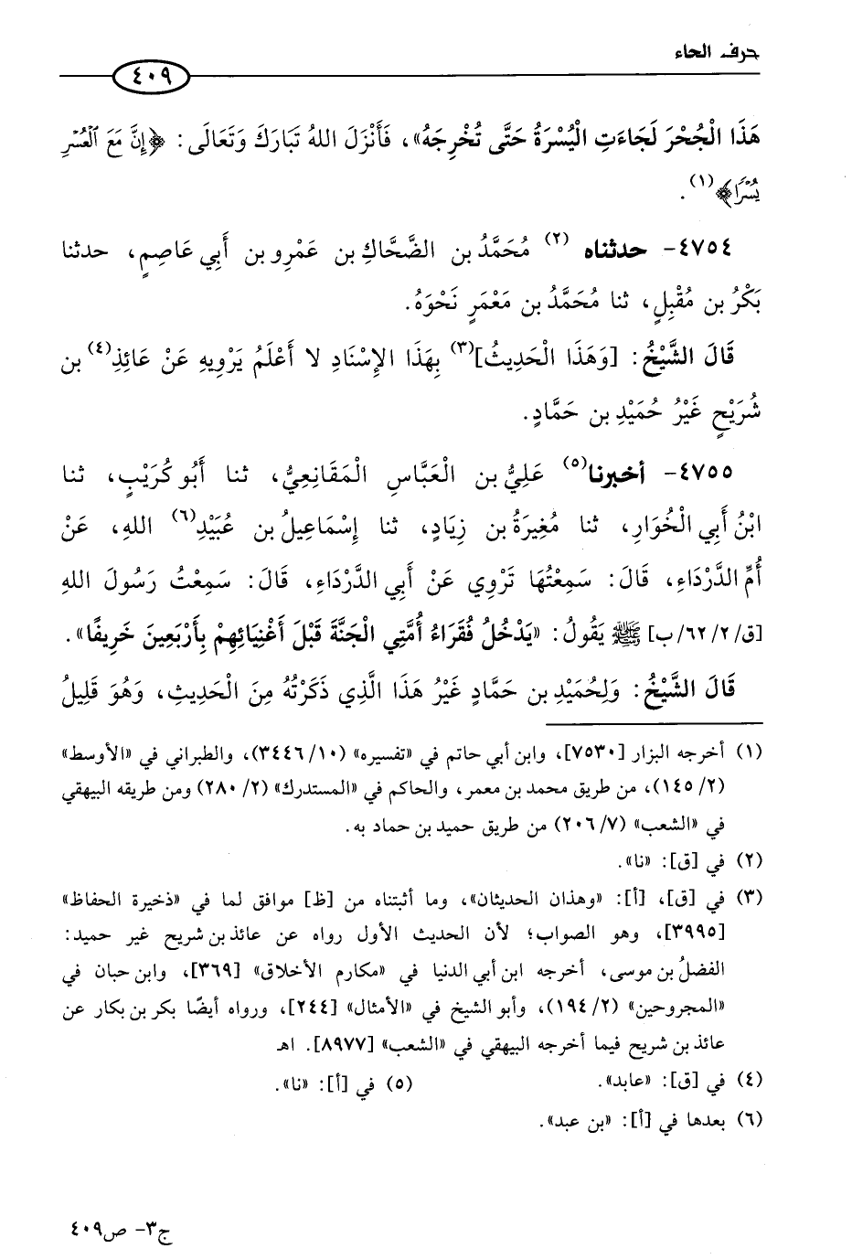 4755 - أخبرنا علي بن العباس المقانعي، حَدثنا أَبو كريب، حَدثنا ابن أبي الخوار، حَدثنا مغيرة بن زياد، حَدثنا إسماعيل بن عُبيد الله، عن أُم الدرداء قال: سمعتُها تروي، عن أبي الدرداء، قال: سمعتُ رسول الله صَلى الله عَليه وسَلم يقول: يدخل فقراء أُمَّتِي الجنة قبل أغنيائهم بأربعين خريفا.