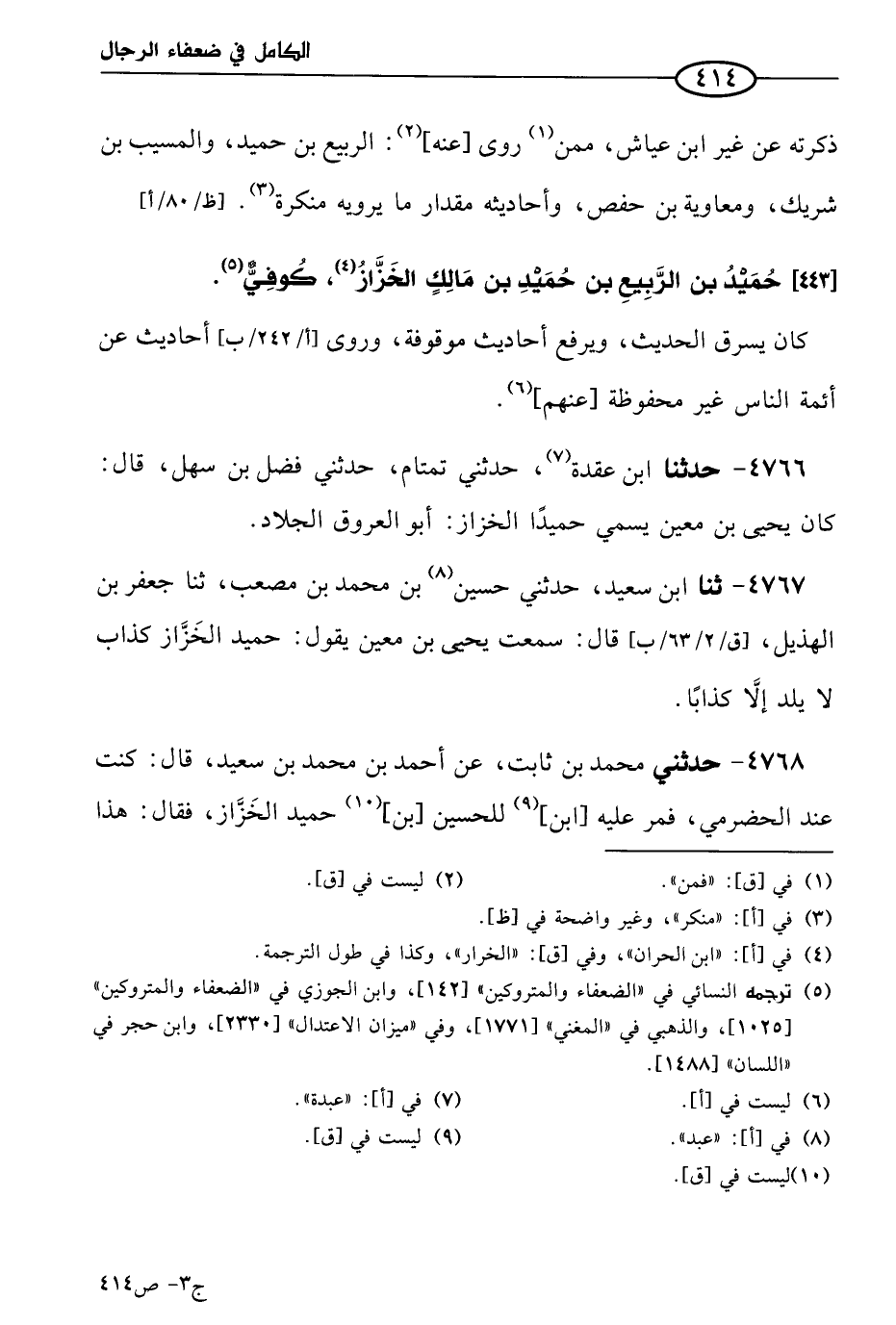 4766 - حَدثنا ابن عقدة، حَدَّثني تمتام، حَدَّثني فضل بن سهل، قال: كان يَحيى بن مَعين يسمي حميدا الخزاز: أبو العروق الجلاد.