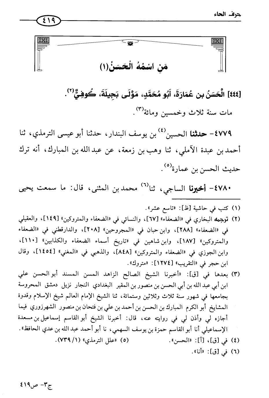 4779 - حَدثنا الحسين بن يوسف البندار، حَدثنا أَبو عيسى التِّرمِذِي، حَدثنا أحمد بن عبدة الآملي، حَدثنا وهب بن زمعة، عن عَبد الله بن المُبَارك؛ أنه ترك حديث الحسن بن عمارة.
