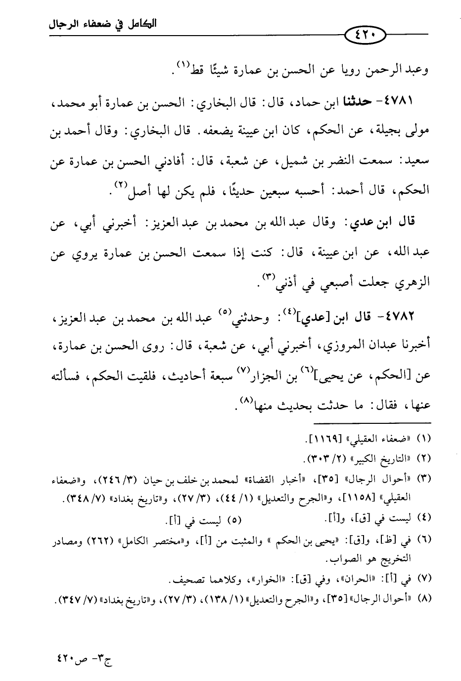 4782 - قال ابنُ عَدِي: وقال عَبد الله بن مُحمد بن عَبد العزيز: أخبرني أبي، عن عَبد الله، عن ابن عُيَينة قال: كنتُ إذا سمعت الحسن بن عمارة يروي عن الزُّهْري جعلت أصبعي في أُذني.