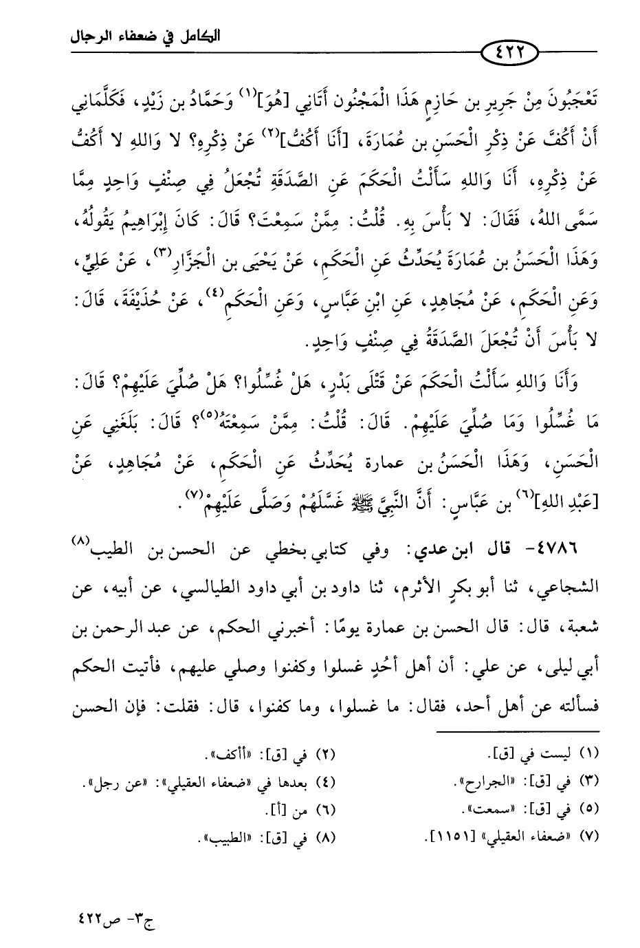 4786 - قال ابنُ عَدِي: وفي كتابي بخطي: عن الحسن بن الطيب الشجاعي، حَدثنا أَبو بكر بن الأثرم، حَدثنا داود بن أبي داود الطيالسي، عن أبيه، عن شُعبَة قال: قال الحسن بن عمارة يومًا: أخبرني الحكم، عن عَبد الرحمن بن أبي ليلى، عن علي؛ أن أهل أُحد غُسلوا وكفنوا وصُلي عليهم، فأتيت الحكم فسألته عن أهل أُحد، فقال: ما غُسلوا وما كفنوا، قال: فقلت: فإن الحسن بن عمارة حدث عنك بكذا وكذا؟ قال: مَا حدثته بهذا قط.