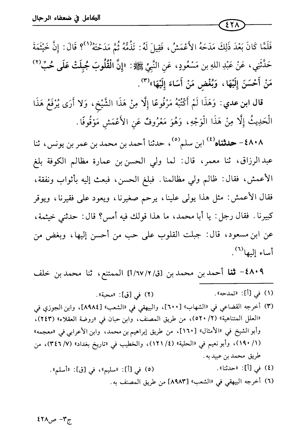 4808 - حَدثناه ابن سلم، حَدثنا أحمد بن مُحمد بن عُمر بن يُونُس، حَدثنا عَبد الرَّزَّاق، حَدثنا معمر، قال: لما ولي الحسن بن عمارة مظالم الكوفة بلغ الأَعمَش، فقال: ظالم ولي مظالمنا، فبلغ الحسن، فبعث إليه بأثواب ونفقة، فقال الأَعمَش: مثل هذا يولى علينا، يرحم صغيرنا ويعود على فقيرنا ويوقر كبيرنا، فقال رجل: يا أبا مُحمد، ما هذا قولك فيه أمس؟ قال: حَدَّثني خيثمة، عن ابن مسعود قال: جبلت القوب على حب من أحسن إليها، وبغض من أساء إليها.