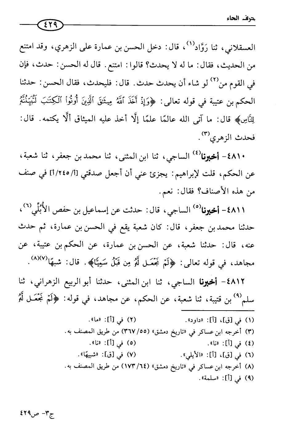 4811 - أخبرنا الساجي قال: حدثت عن إسماعيل بن حفص الأبلي، حَدثنا مُحمد بن جعفر، قال: كان شُعبَة يقع في الحسن بن عمارة ثم حدث عنه، قال: حَدثنا شُعبَة، عن الحسن بن عمارة، عن الحكم بن عتيبة، عن مجاهد؛ في قوله تعالى: {لم نجعل له من قبل سميا} قال: شبيها.