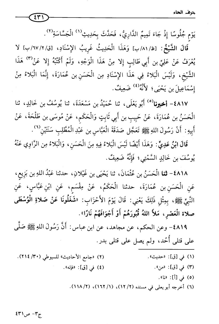 4817 - أخبرنا أَبو يَعلَى، حَدثنا حميد بن مسعدة، حَدثنا يوسف بن خالد، حَدثنا الحسن بن عمارة عن حبيب بن أبي ثابت، والحكم عن موسى بن طلحة، عن أبيه؛ أَن رسُول الله صَلى الله عَليه وسَلم تعجل صدقة العباس بن عَبد المطلب سنتين.