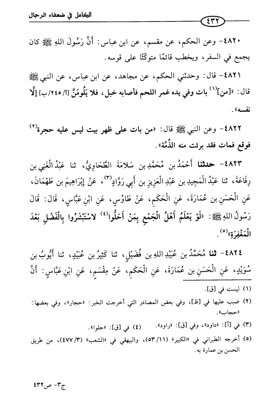 4823 - حَدثنا أحمد بن مُحمد بن سلامة الطحاوي، حَدثنا عَبد الغني بن رفاعة، حَدثنا عَبد المجيد بن عَبد العزيز بن أبي رَوَّاد، عن إبراهيم بن طهمان، عن الحسن بن عمارة، عن الحكم، عن طاووس، عن ابن عباس، قال: قال رسول الله صَلى الله عَليه وسَلم: لَو يَعلَمُ أَهْلُ الجَمع بِمن حَلُّوا (1)، لاَستَبْشَرُوا بِالفَضْل بَعد المَغْفِرَةِ.