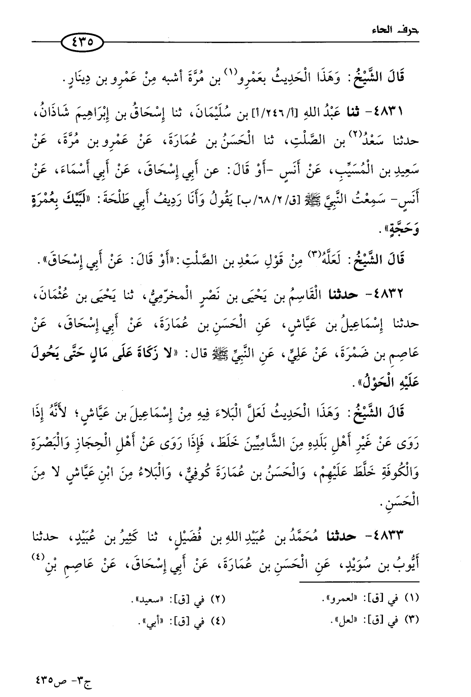 4831 - حَدثنا عَبد الله بن سليمان، حَدثنا إسحاق بن إبراهيم شاذان، حَدثنا سعد بن الصلت، حَدثنا الحسن بن عمارة، عن عَمرو بن مرة، عن سعيد بن المُسَيَّب، عن أَنَس، أو قال: عن أبي إسحاق، عن أبي أسماء، عن أَنَس، سمعت النبي صَلى الله عَليه وسلم يقول، وأنا رديف أبي طلحة: لبيك بعمرة وحجة.