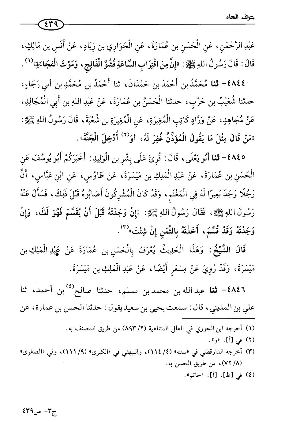 4844 - حَدثنا مُحمد بن أحمد بن حمدان، حَدثنا أحمد بن مُحمد بن أبي رجاء، حَدثنا شُعَيب بن حرب، حَدثنا الحسن بن عمارة، عن عَبد الله بن أبي المجالد، عن مجاهد، عن وراد كاتب المغيرة، عن المغيرة بن شُعبَة، قال رسول الله صَلى الله عَليه وسَلم: مَن قال مثل ما يقول المؤذن غفر له وأُدخل الجنة (1).
