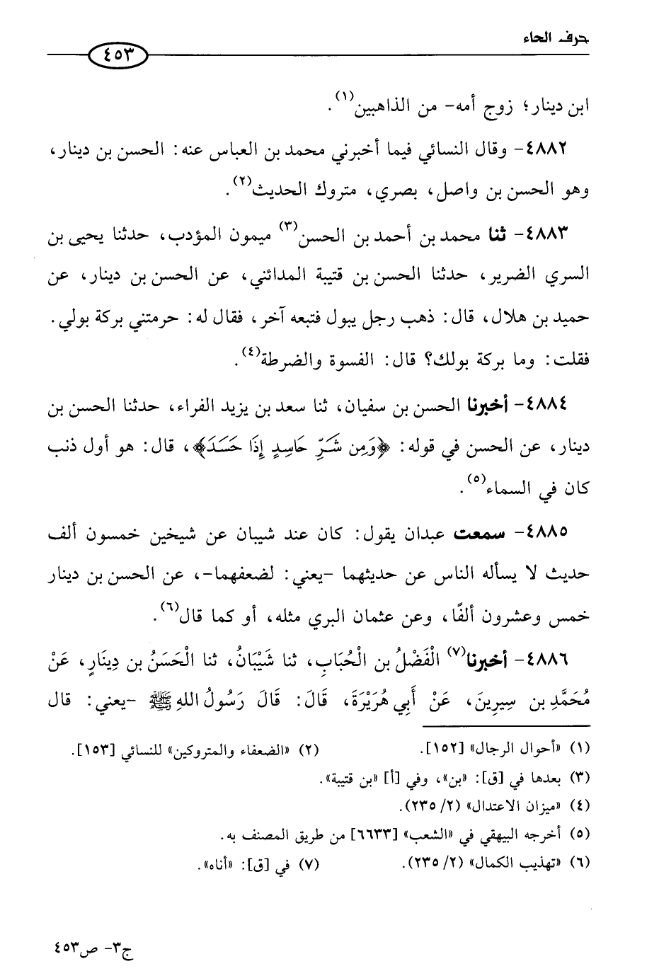 4885 - سمعت عبدان يقول: كان عند شيبان عن شيخين خمسون ألف حديث، لا يسأله الناس عن حديثهما، يعني لضعفهما، عن الحسن بن دينار خمس وعشرون ألفا، وعن عثمان البري مثله، أو كما قال.