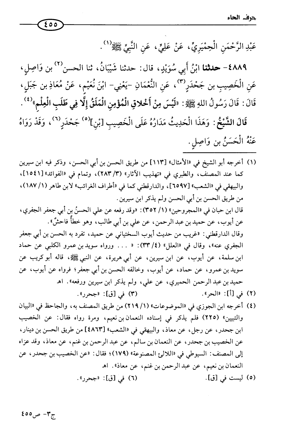 4889 - حَدثنا ابن أبي سويد، قال: حَدثنا شيبان، حَدثنا الحسن بن واصل، عن الخصيب بن جحدر، عن النعمان، يَعني ابن نعيم، عن معاذ بن جبل، قال: قال رسول الله صَلى الله عَليه وسَلم: ليس من أخلاق المؤمن الملق إلا في طلب العلم.